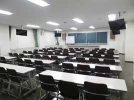 スクリーン、ホワイトボード、ビデオデッキ、DVDデッキ、固定マイク 1、ワイヤレスマイク 1、テレビモニター 4