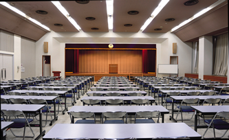 ワイヤレスマイク 4、カセット・MD録音、カセット・CD・MD再生、電動スクリーン(150インチ)、電動遮光ブラインド、ピアノ、演壇、ホワイトボード |