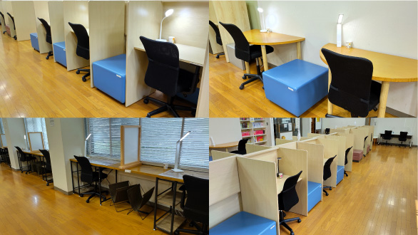 - 1人用の学習机が28席あります。集中できるよう、一つひとつが仕切られています。